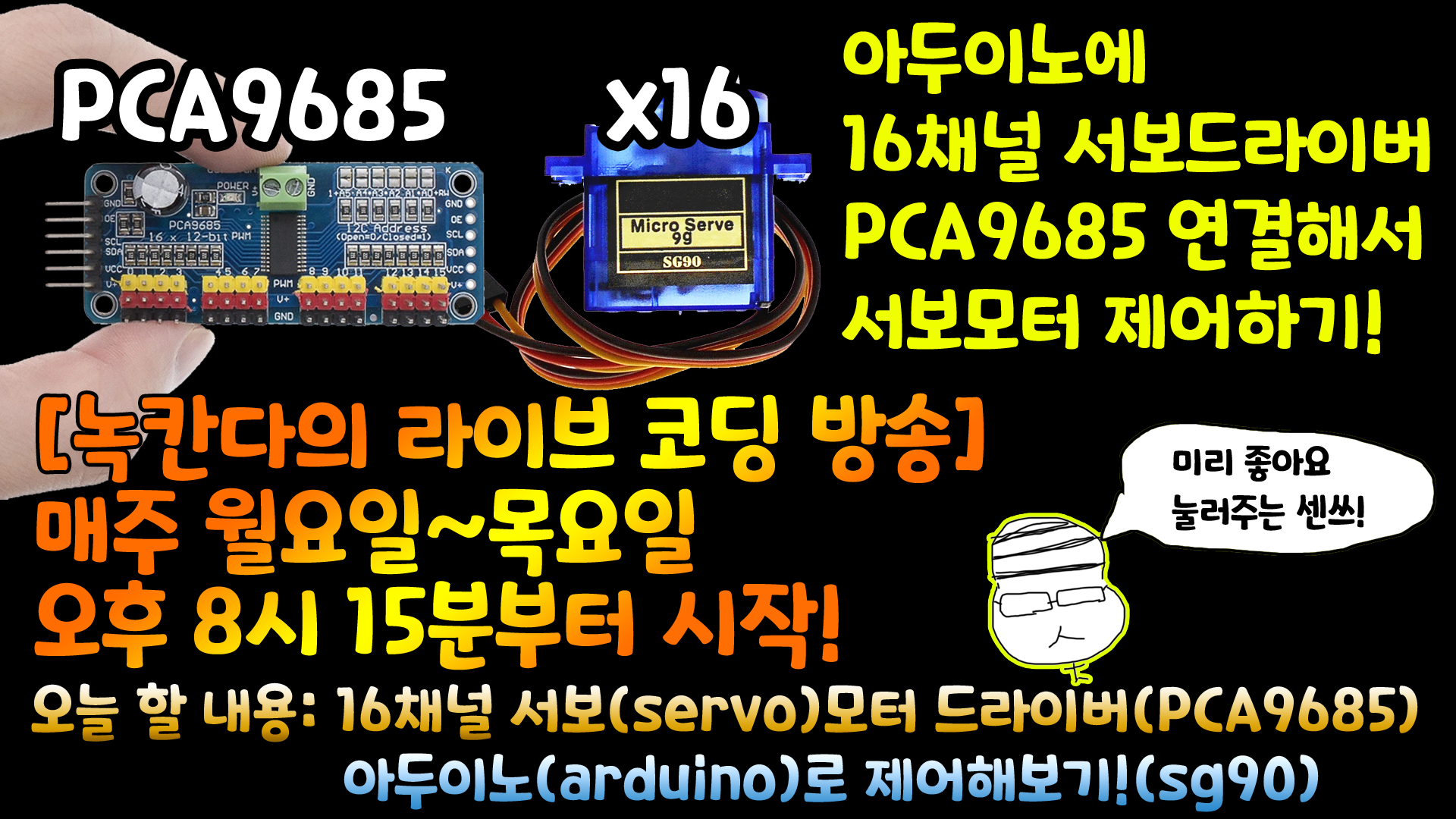 이번편은 아두이노에 16채널 서보모터(servo motor) 드라이버인 PCA9685를 연결해서 서보모터(sg90) 16개를 제어해보는 것이 주제이다!