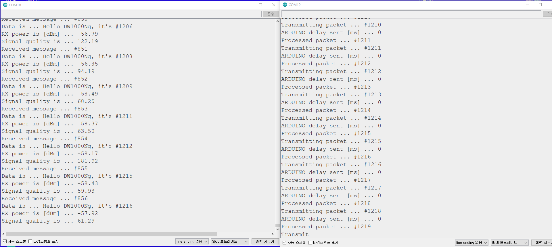 라이브러리의 기본적인 송수신테스트를 수행하면 아래와 같이 보드 2대가 메시지를 주고받을 수 있어야합니다~~~! 안되면? 다시 납땜하기~~~!