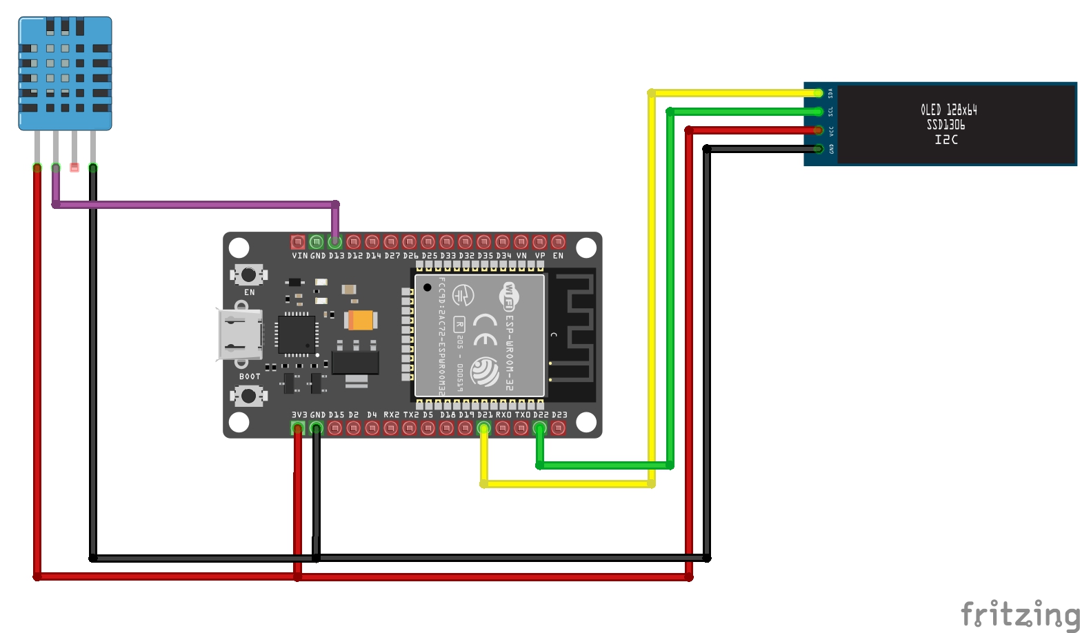 3.(예제2번에서)ESP32에 온습도센서(DHT-11)을 13번핀에 연결해서 측정한 온도값을 디스플레이1에 출력하고 습도값을 디스플레이 2에 출력하는 예시를 구현하시오!