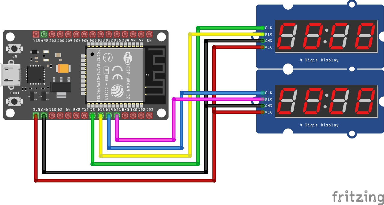 2.(예제1번에서)ESP32에 TM1637을 2개 연결하는데 첫번째 모듈은 CLK를 5번에 연결하고 DIO를 18번에 연결하고 두번째 모듈은 CLK를 19에 연결하고 DIO를 21에 연결해서 시리얼모니터에 입력한 숫자를 FND모듈에 출력되도록 하시오!
