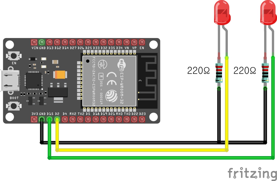 3.ESP32의 15번핀과 2번핀에 LED를 연결하고 스마트폰에서 아래와 같은 명령을 보낼때 제어되도록 하시오!