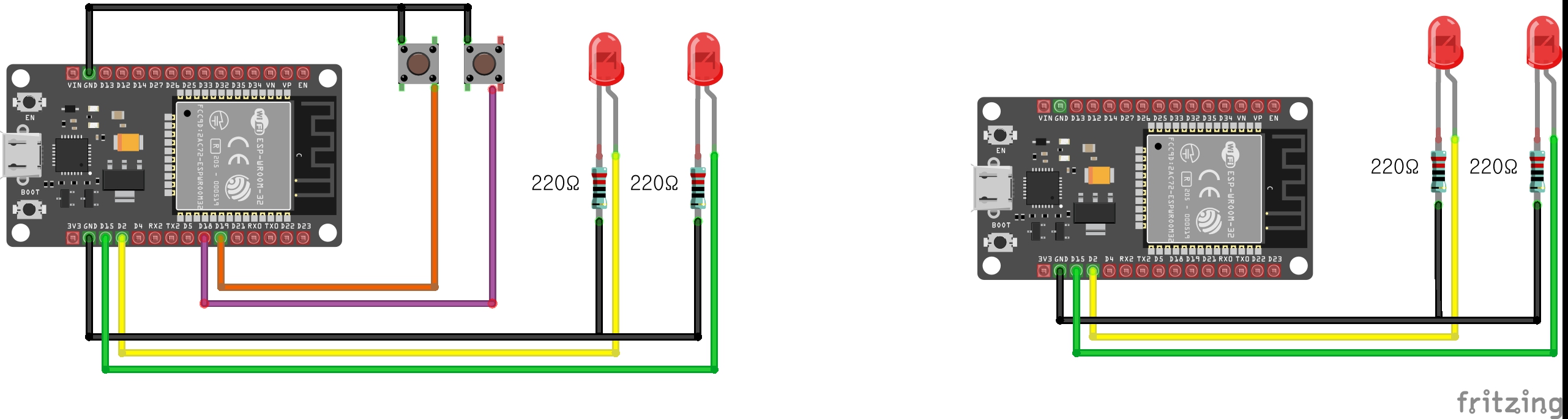 6.(예제3에서) ESP32보드 2대를 각각 1호기와 2호기라고 할때 1호는 예제 3을 그대로 유지하면서 버튼 2개를 각각 18번과 19번에 연결한다! 2호기에도 LED가 2개가 연결되어있고 1호기에서 18번버튼을 누르면 2호기의 1번 LED가 토글된다! 1호기의 19번버튼을 누르면 2호기의 2번LED가 토글되도록 하시오!