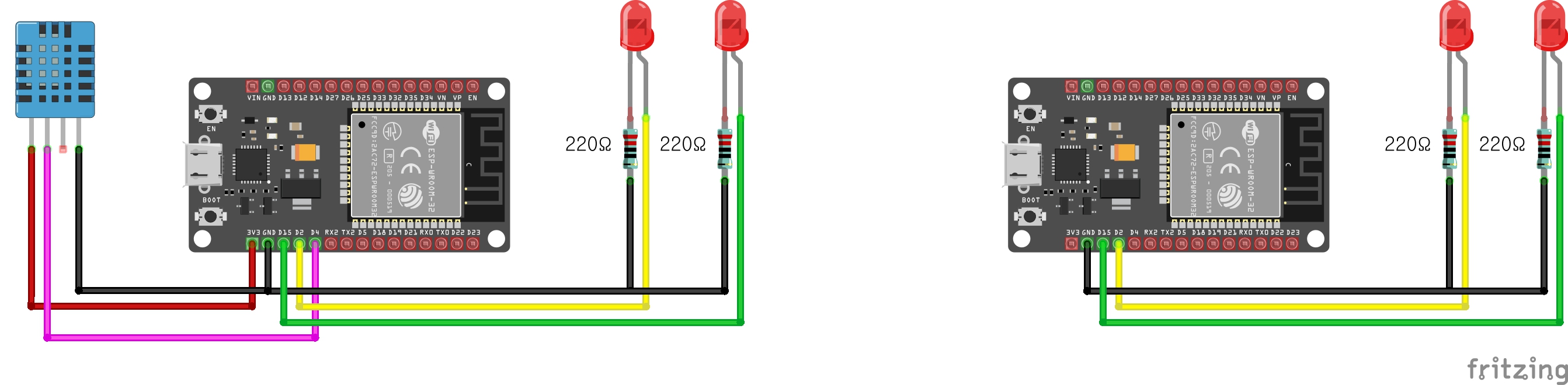 7.(예제4번에서) ESP32보드 2대를 각각 1호기와 2호기라고 할때 1호기는 예제 4번과 동일하게 온습도센서와 LED2개를 연결하고 2호기는 LED2개와 1602LCD를 연결한다! 1호기에서 publish한 온습도값을 2호기에서 수신해서 시리얼모니터에 출력하시오!(led2개를 각각 제어하는 예시는 그대로두고 온습도센서값만 1호기에서 2호기로 넘겨서 시리얼모니터에 출력)
