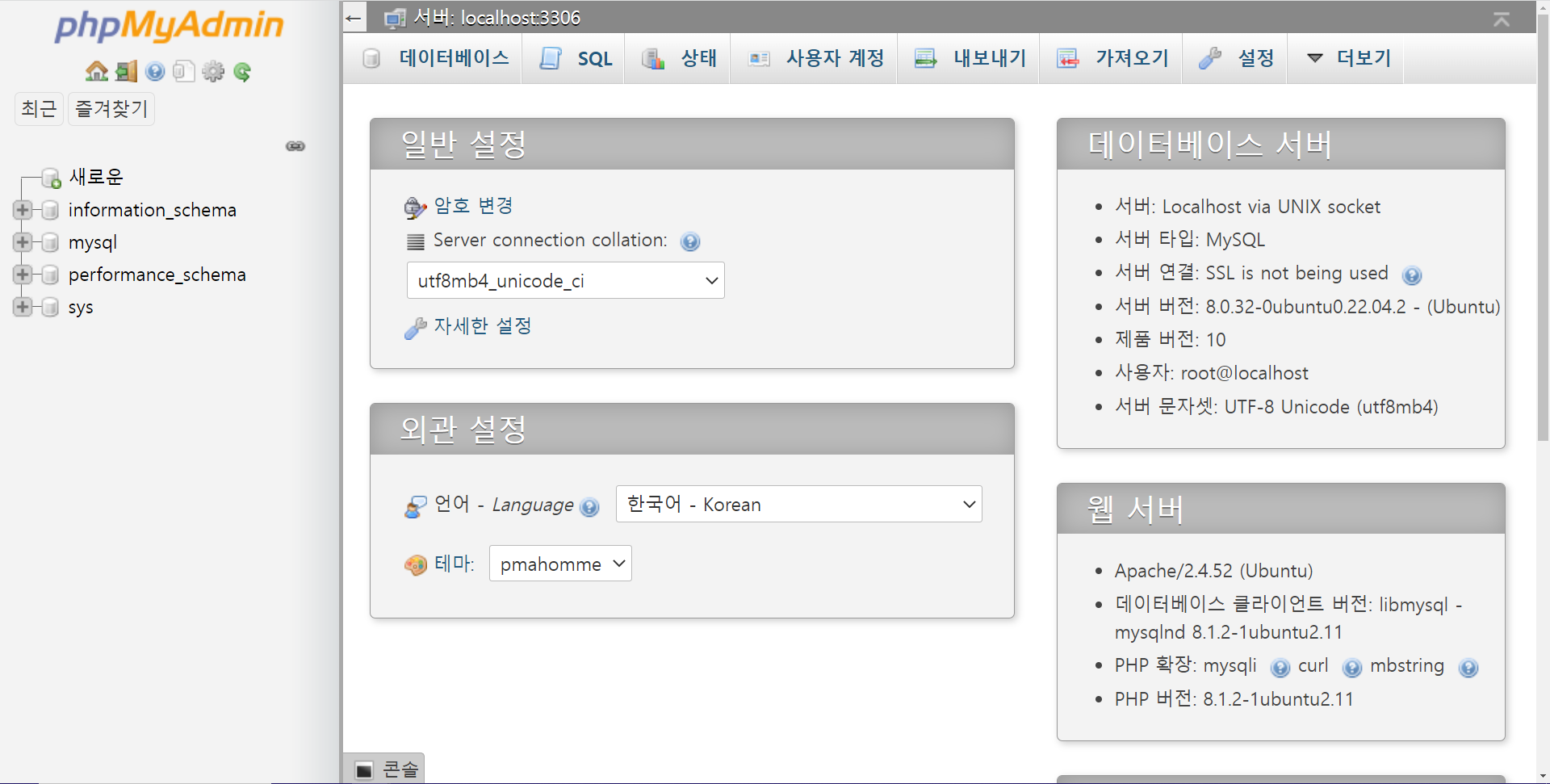 그러면 phpmyadmin이 정상작동하고 mysql작업을 여기서 할 수 있다!