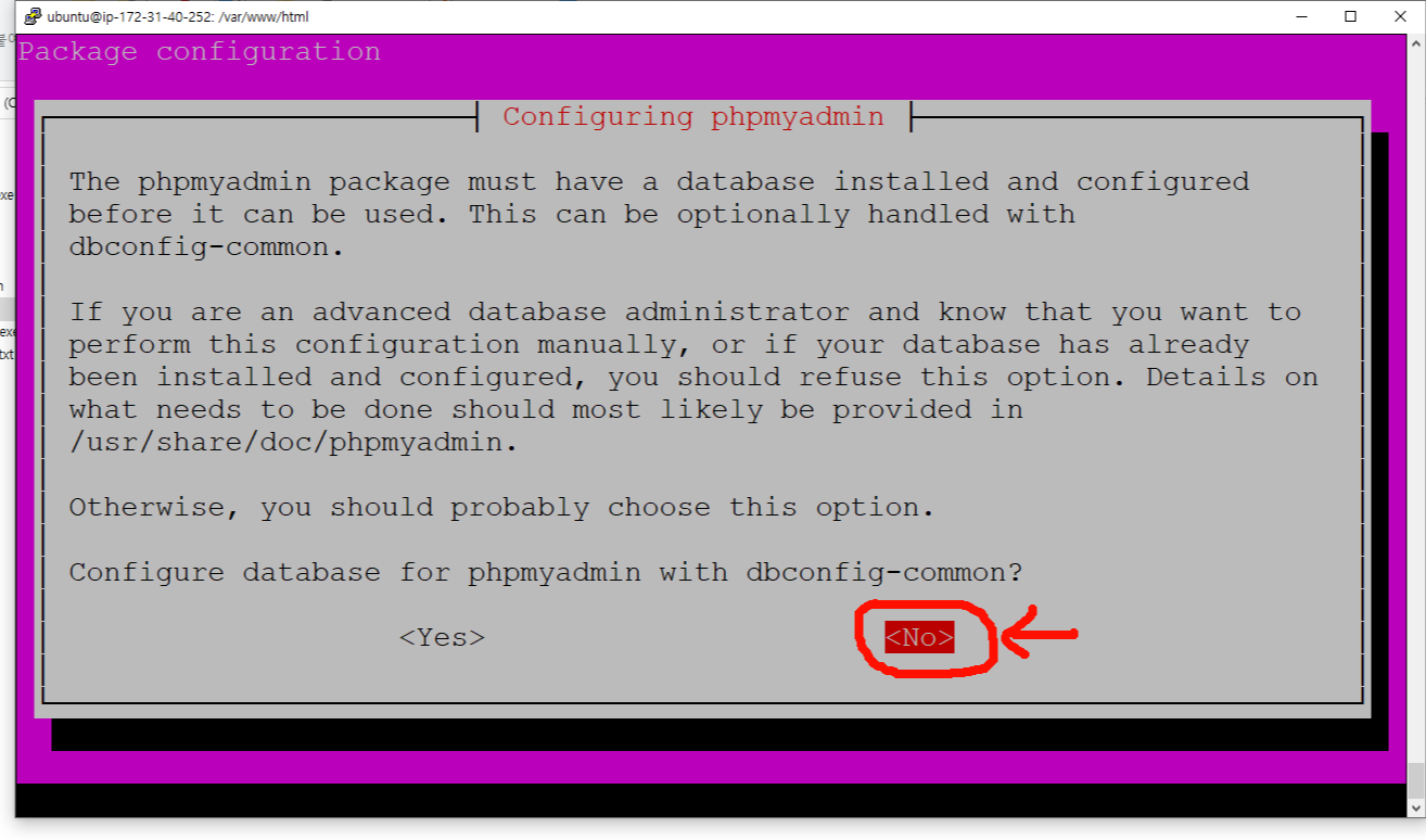 우리는 이미 mysql을 설치한 상태이므로 "No"를 선택해주어야 한다!
