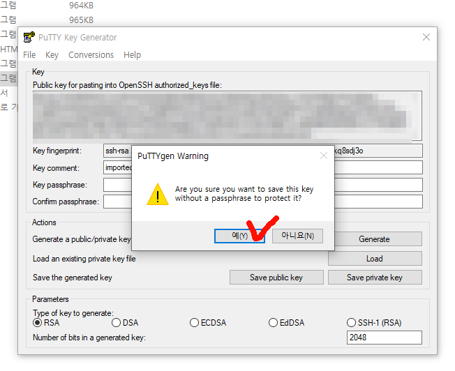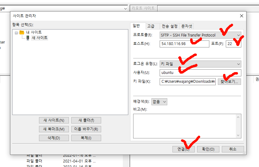 키파일은 "찾아보기"를 눌러서 아까 만들어두었단 ppk파일을 선택하면 된다!
