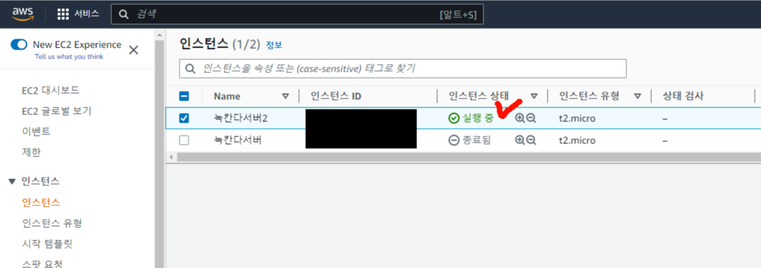 내가 EC2에 만든 인스턴스 목록이 이 페이지에서 출력된다!