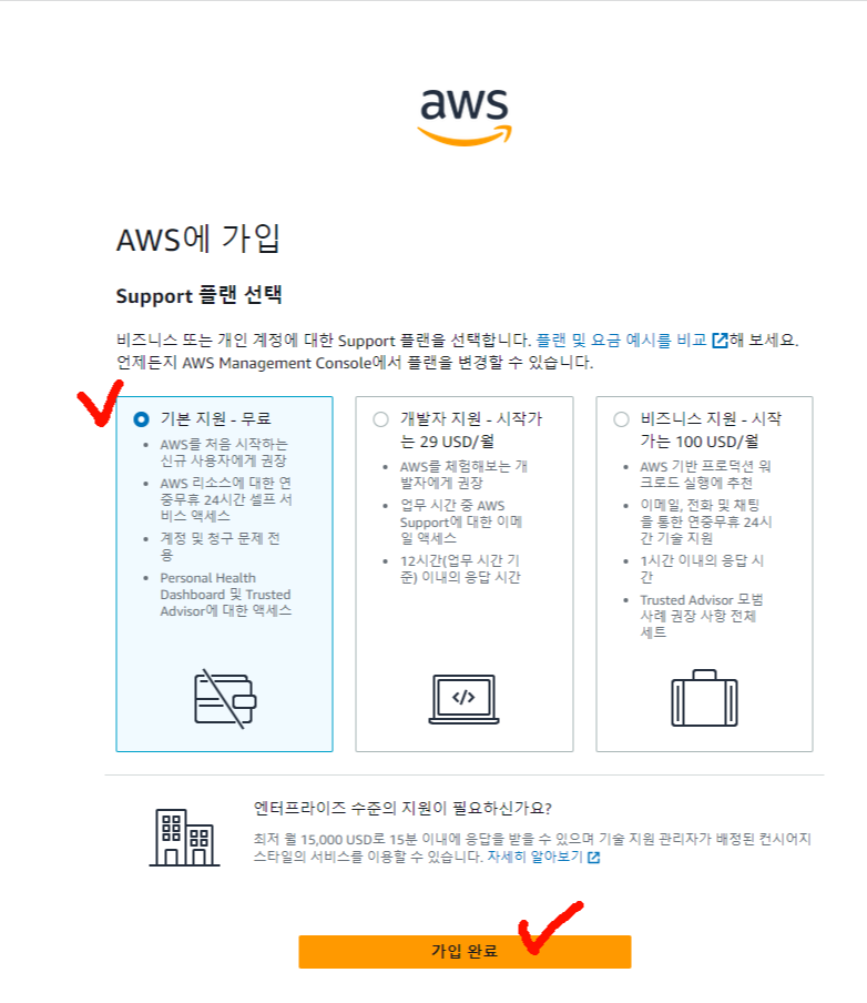 그리고 12개월 동안 무료로 사용할 수 있는 기본 지원을 선택하고 가입완료를 한다!