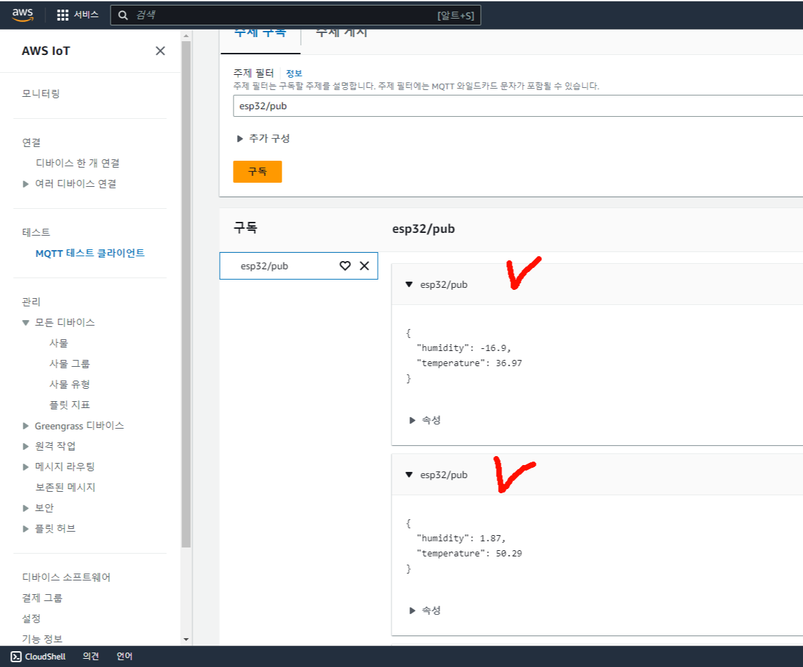 aws로 가서 "MQTT 테스트 클라이언트" 부분에 ESP32가 publish하는 topic을 화면과 같이 작성한다음 "구독"을 눌러준다!