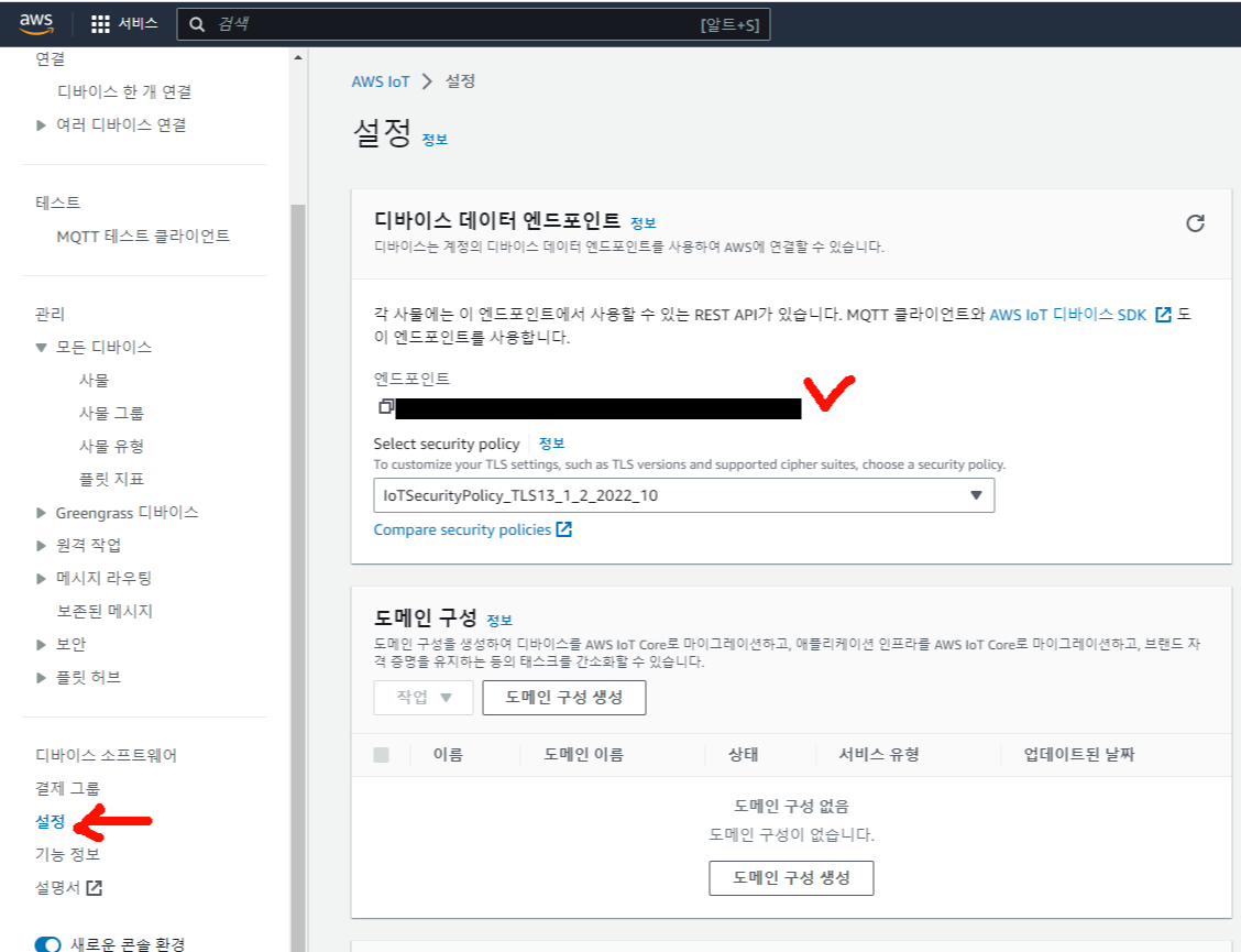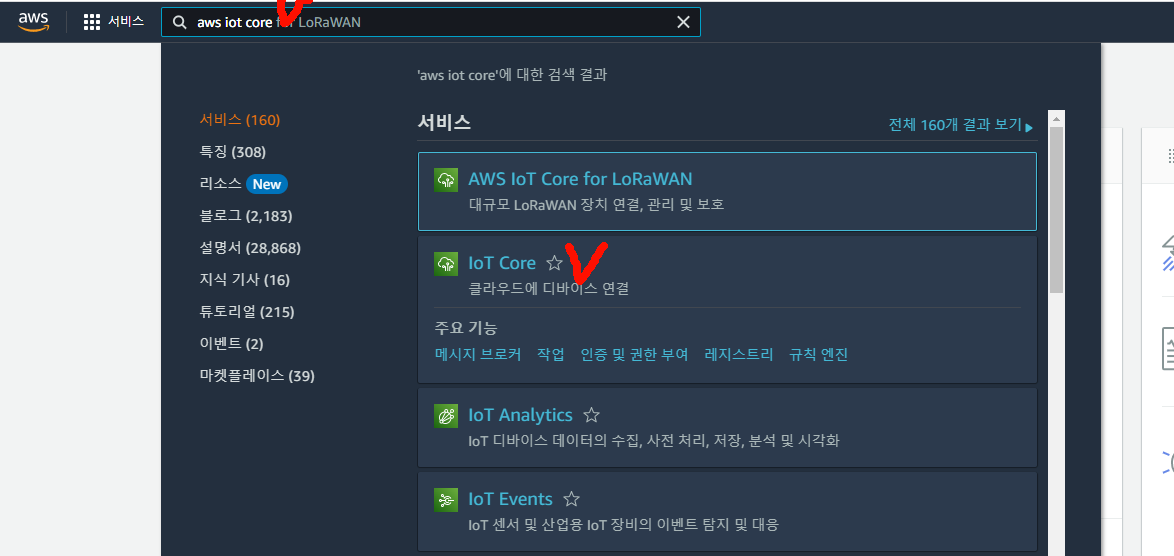 aws 콘솔로 이동한다음 검색하는 곳에 iot core라고 검색해서 해당 서비스로 이동한다!