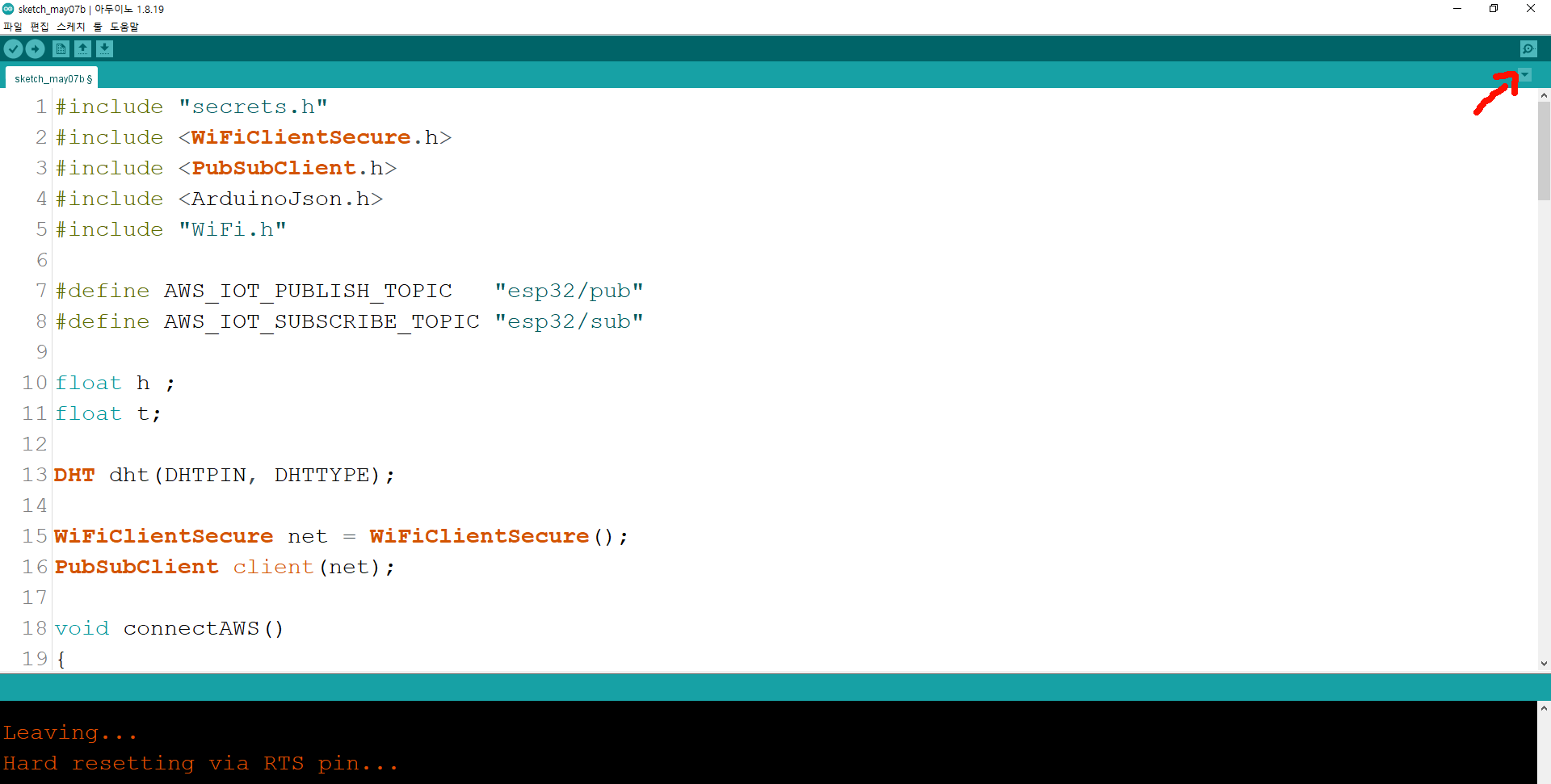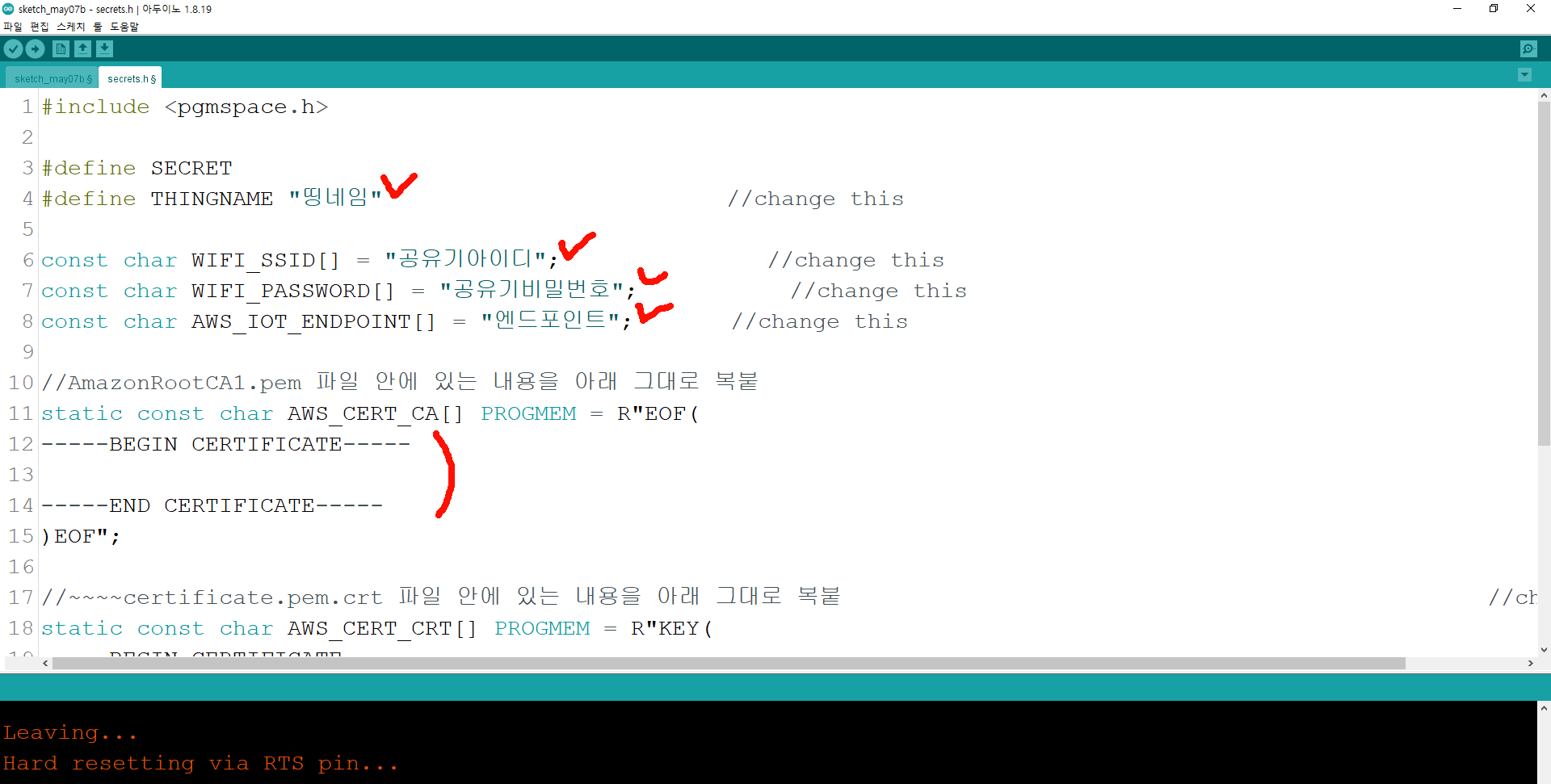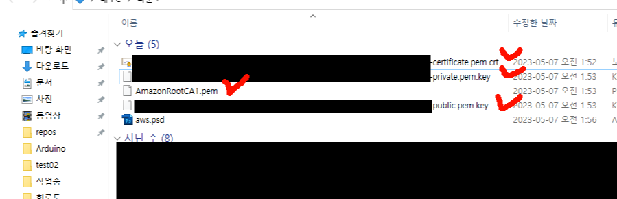 여기가지 했으면 aws iot에 등록하는 절차를 진행했고 이제 ESP32에 코드를 올려야한다!