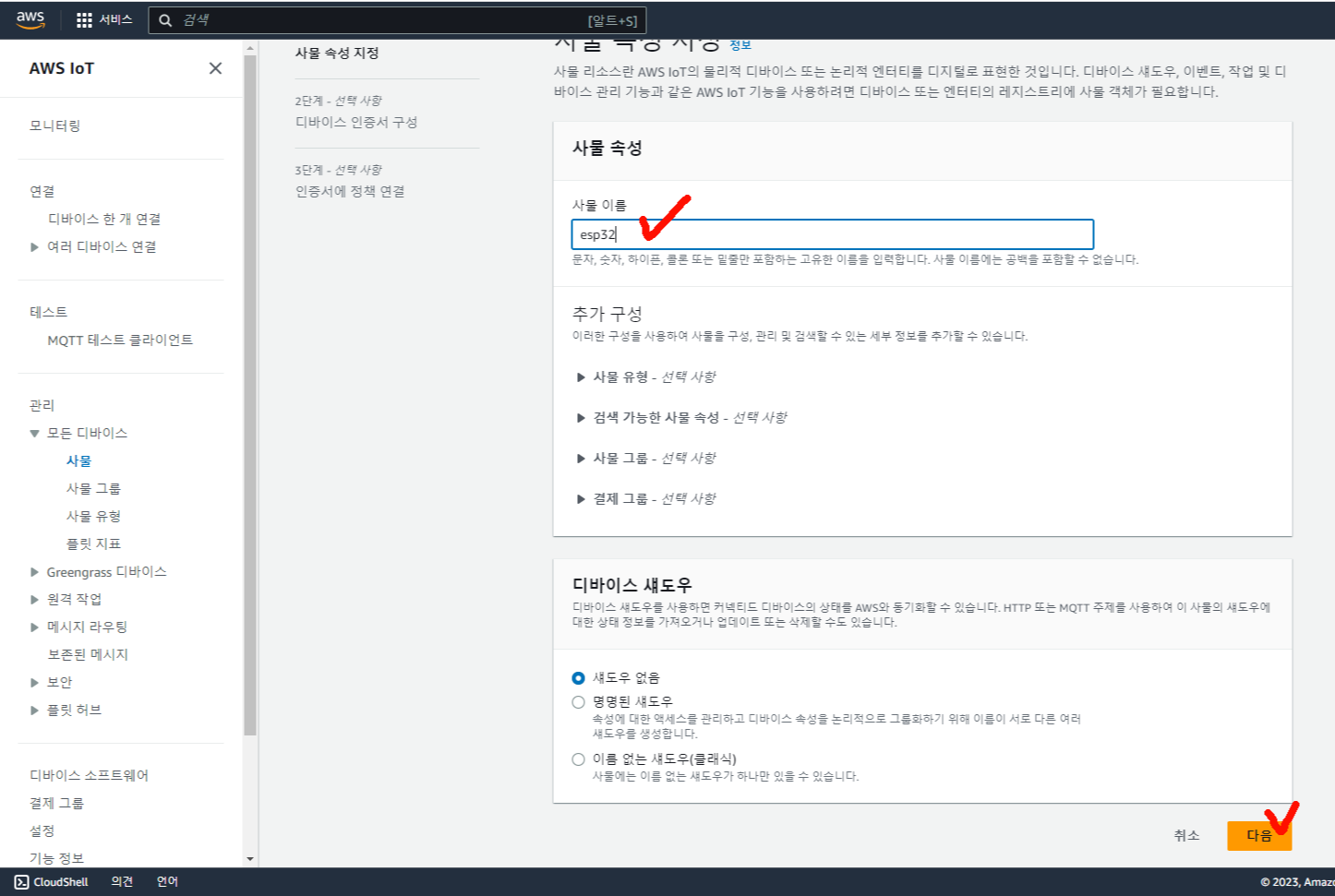 그리고 앞으로 이것을 thing name이라고 부를 것이다!(나중에 ESP32코드에 띵 네임을 작성하는 부분이 생김)