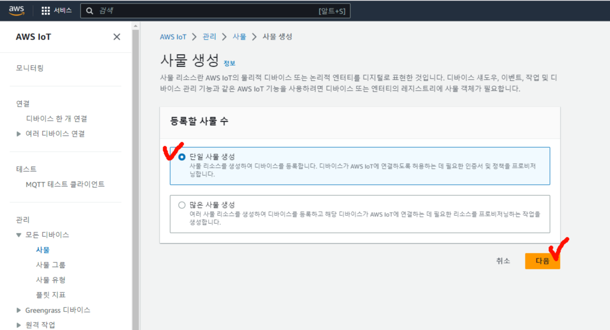 기본으로 단일 사물 생성에 체크가 되어있으므로 "다음" 누르면 된다!