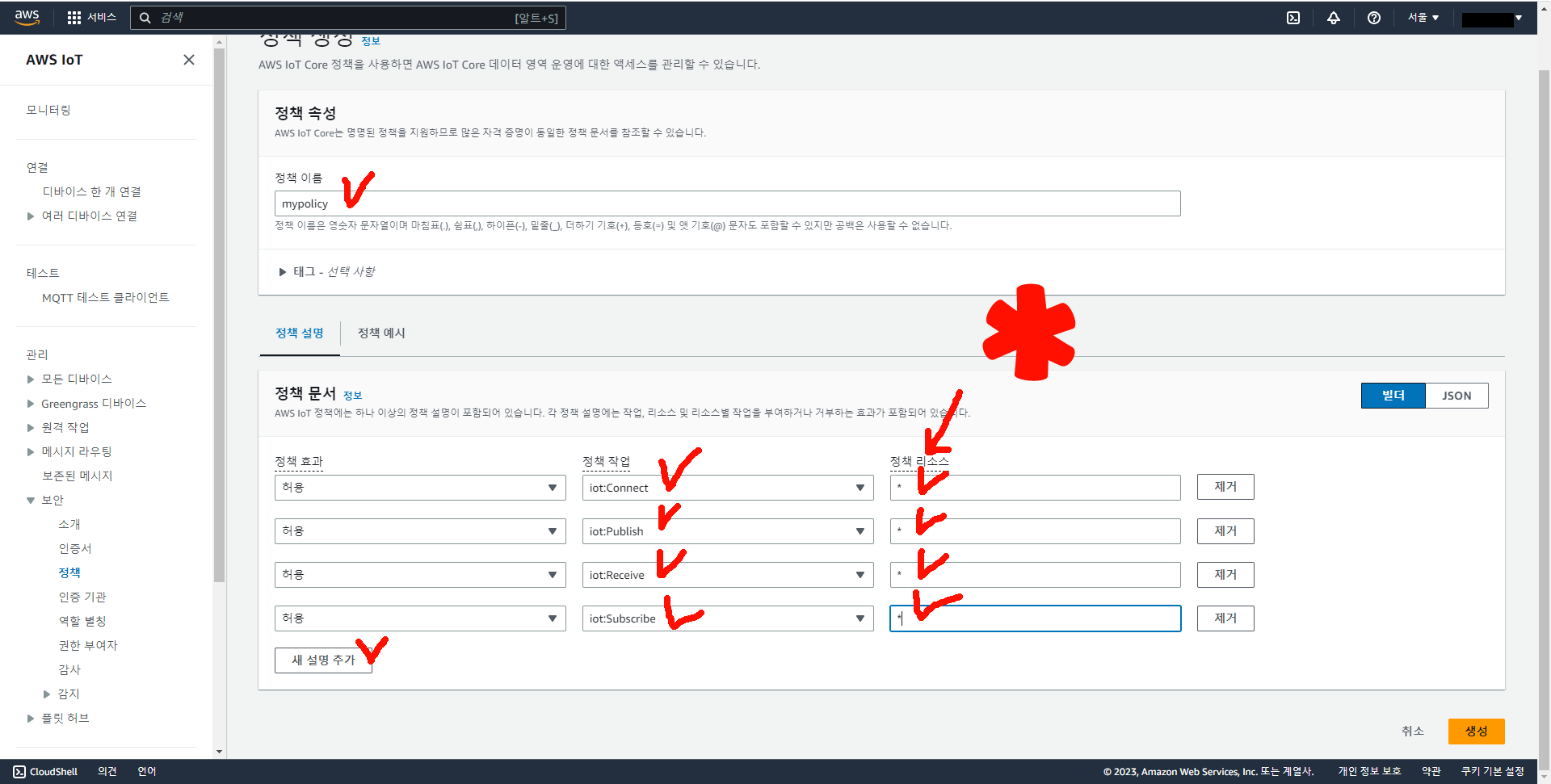본인이 생성한 정책에 체크를 하고 "사물 생성" 버튼을 눌러준다!