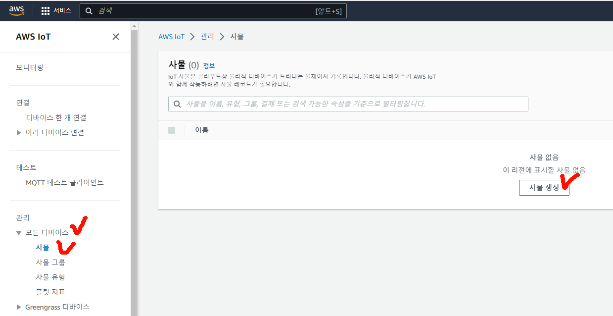 "모든 디바이스"에 "사물"을 선택한다음 "사물 생성"버튼을 눌러서 보드 등록을 해보도록 하자!