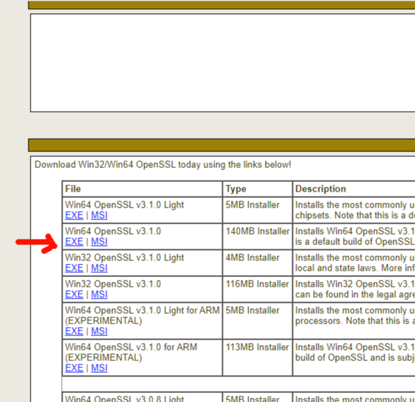 하단에 가장 최신버전의 openssl의 exe파일을 다운로드 받는다!