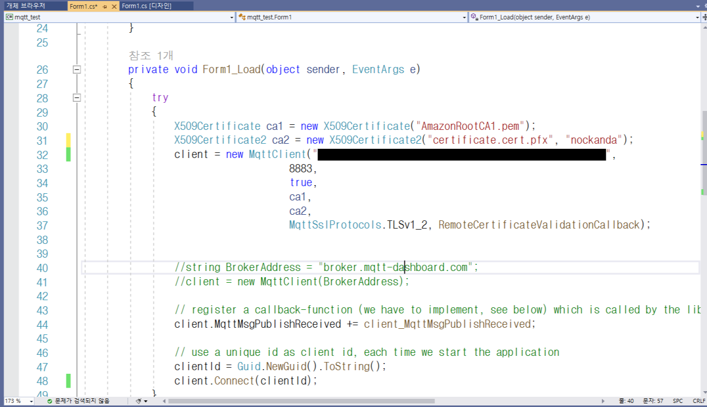 새롭게 만든 디바이스 인증서와 CA인증서를 C#윈폼 프로젝트로 가지고 간다!