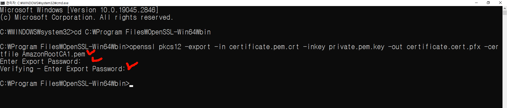 openssl pkcs12 -export -in certificate.pem.crt -inkey private.pem.key -out certificate.cert.pfx -certfile AmazonRootCA1.pem