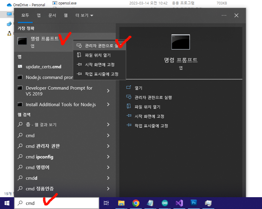 cmd라고 검색해서 "명령 프롬프트"에 마우스 오른쪽 버튼을 눌러서 관리자권한으로 실행한다!
