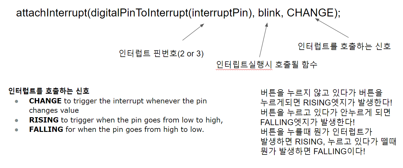 아두이노에서 인터럽트를 사용하기 위해서는 아래와 같은 함수가 필요합니다~!