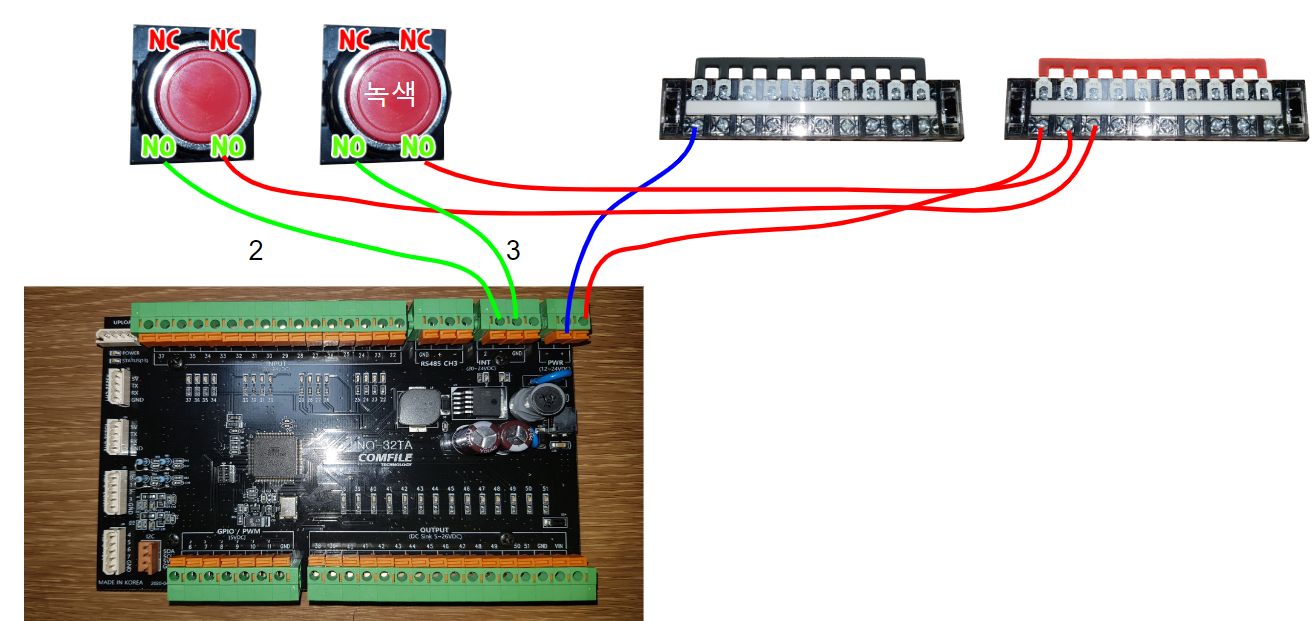 1.적색버튼이 2번, 녹색버튼이 3번에 연결되어있다(입력)