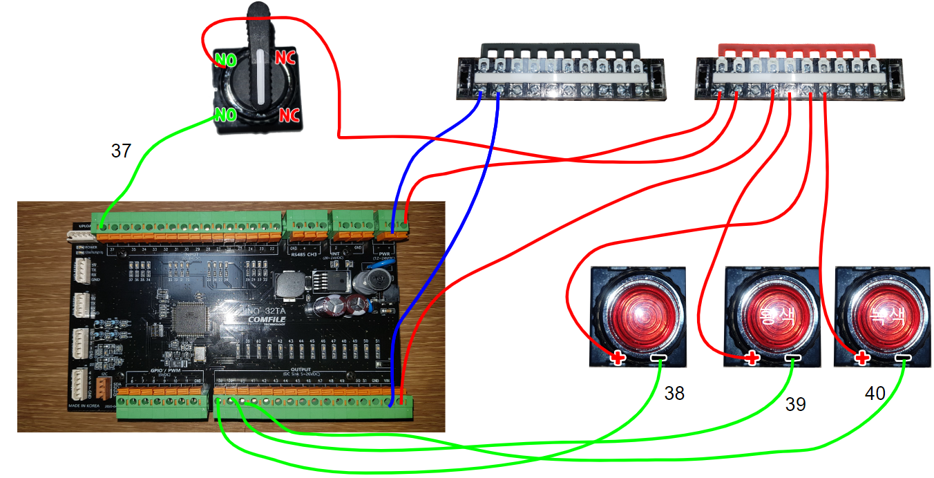 4.셀렉터 스위치에 위치에 따라서 적색(38) 혹은 녹색(40) 램프를 작동시키시오!