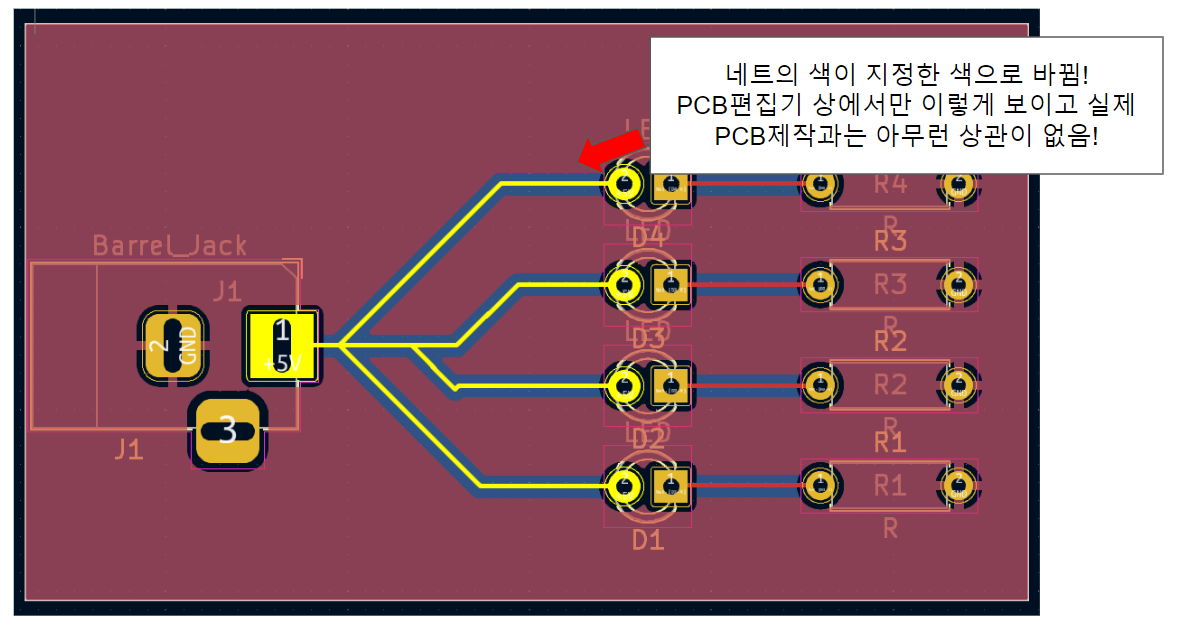 1.배선색 바꾸는 방법을 예제로 구현하시오!(5V전원으로 LED 4개를 작동시키는 PCB)