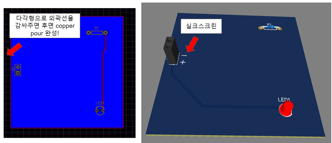 -참조필드, 필드값, 네트라벨, 전원라벨, copper pour, 배선 라우트, 전후면 구리레이어, 전후면 실크스크린, 보드아웃라인(엣지컷)