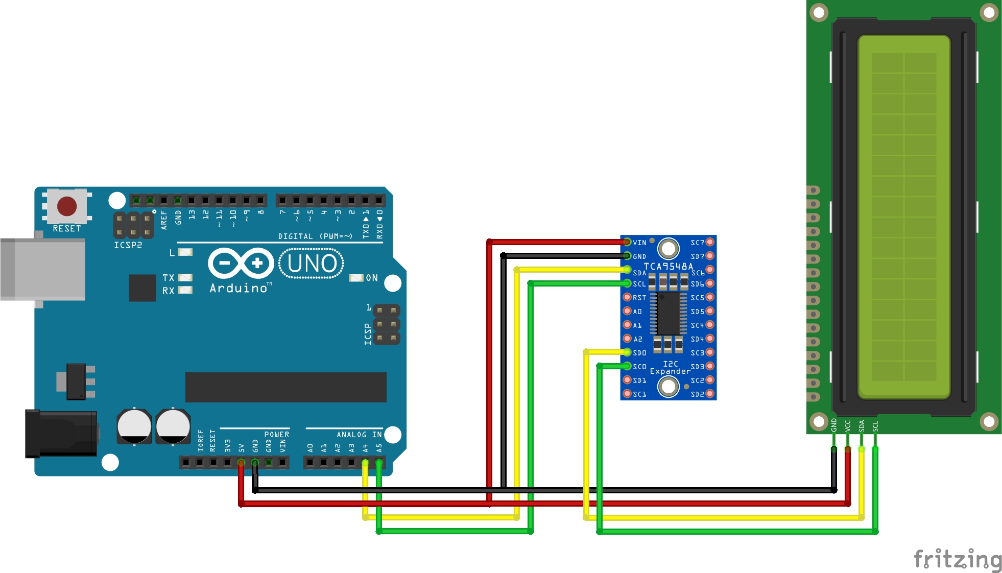 1.아두이노 우노가 i2c통신으로 제어되는 1602LCD 1개를 컨트롤 하는 예시