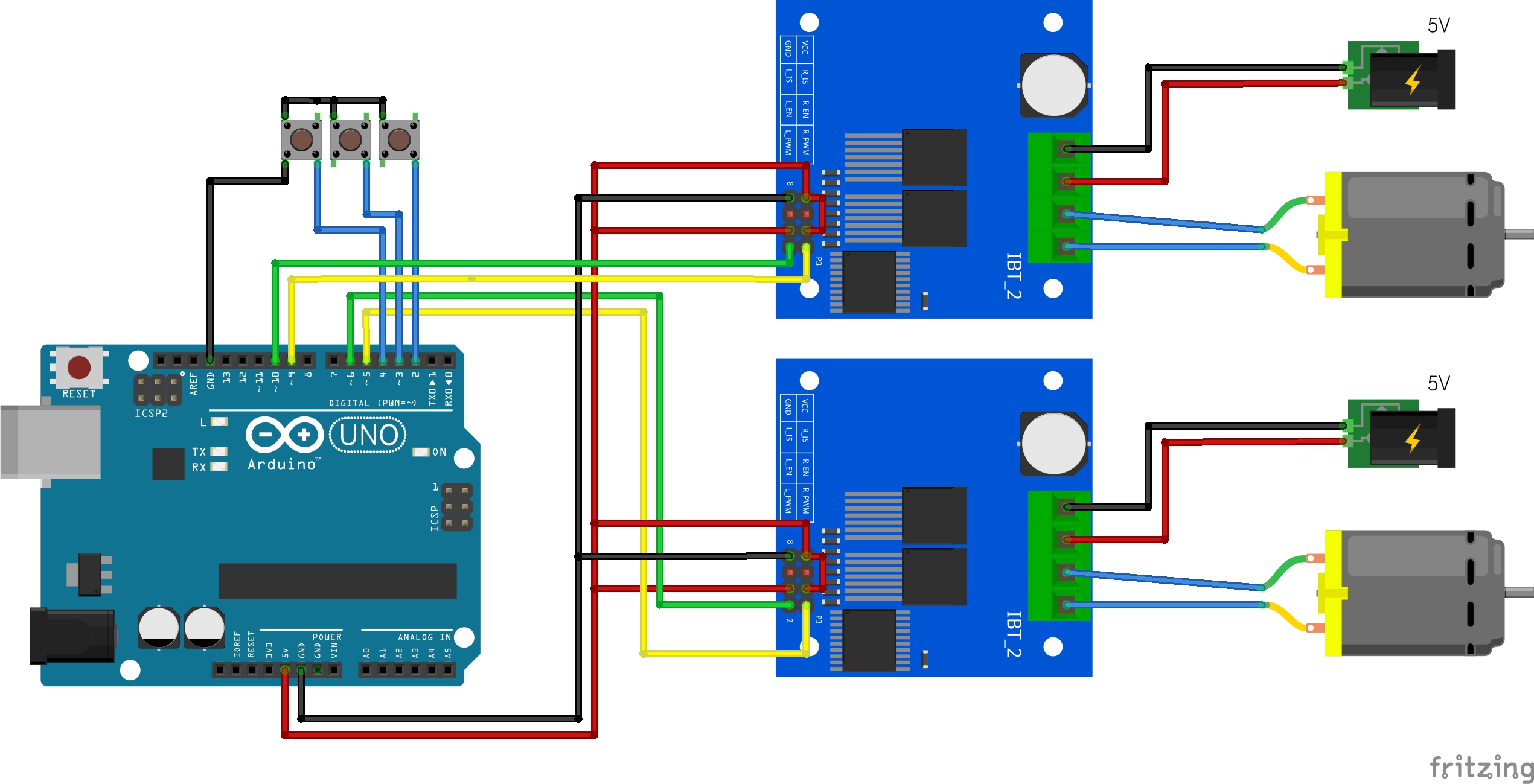 7.모터드라이버 2개를 아두이노에 연결하고 예제2번에 있던 버튼 3개를 그대로 활용해서 동시에 작동되도록 하시오!
