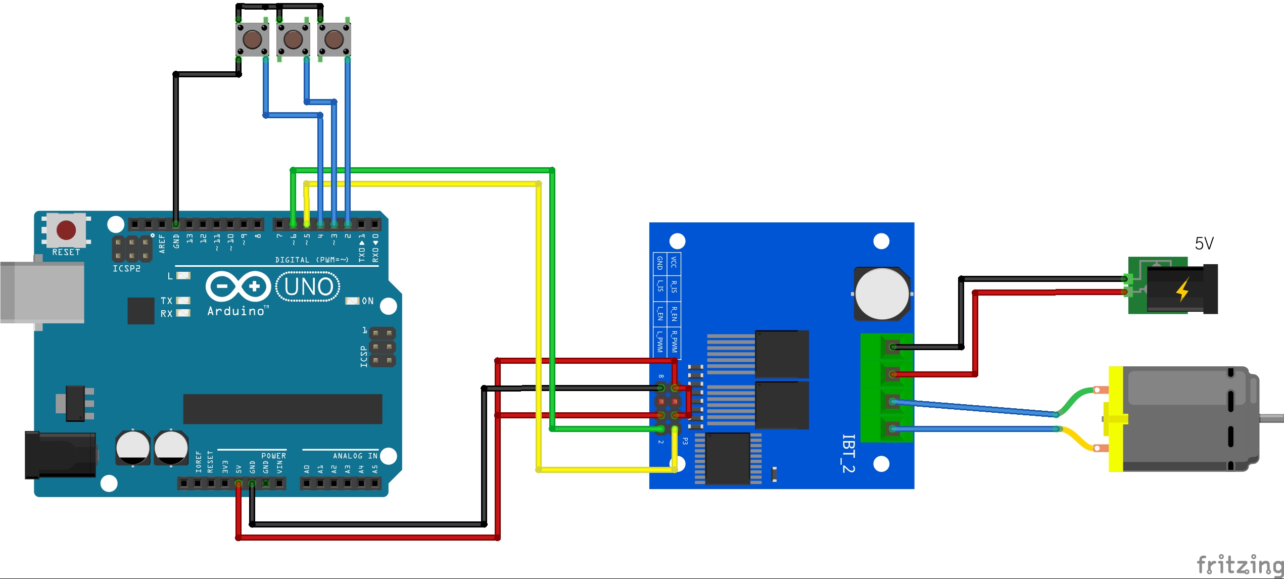 2.버튼 3개를 2,3,4번핀에 연결하고 2번핀버튼을 누르면 정회전, 3번핀버튼을 누르면 멈춤, 4번핀버튼을 누르면 역회전을 하도록 하시오!