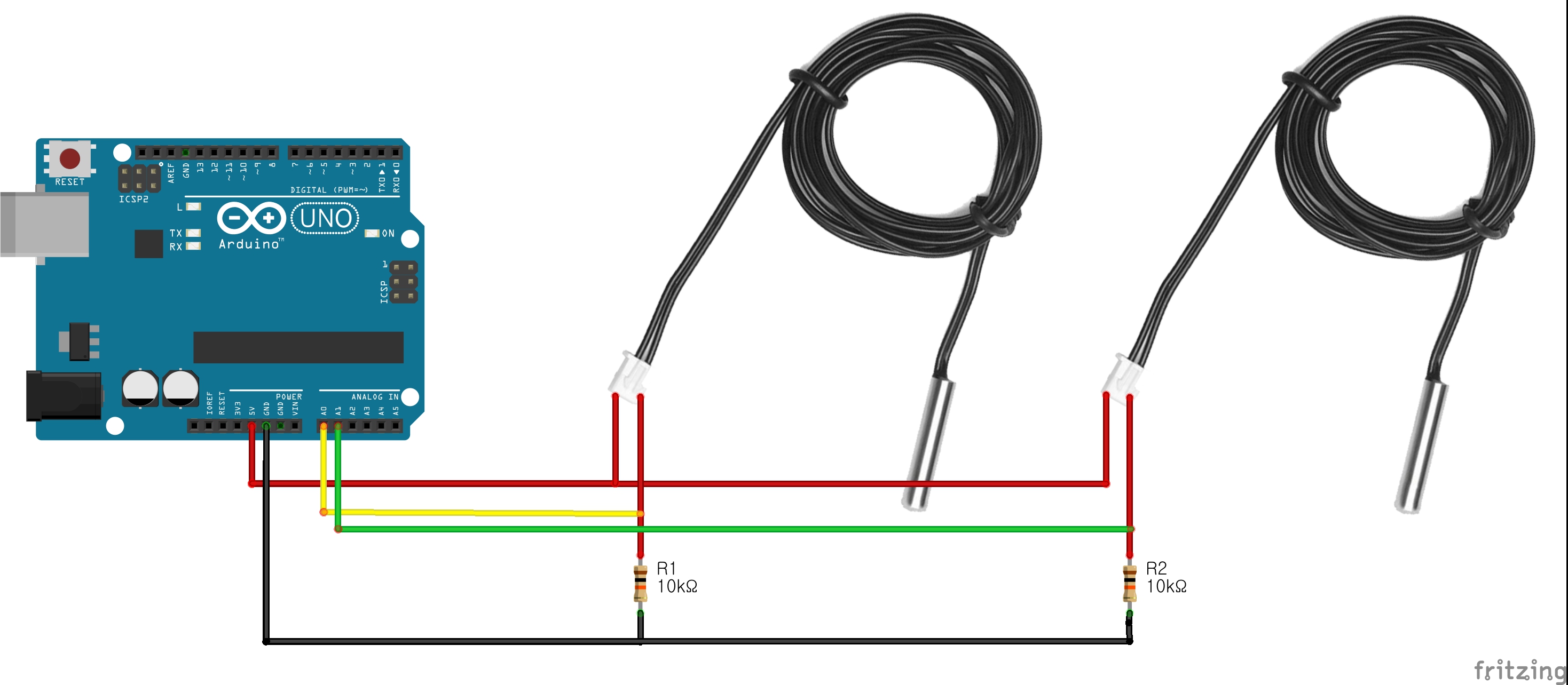 5.NTC서미스터를 2개 연결해서 동시에 2개의 온도를 측정하고 결과를 시리얼모니터에 출력하시오!(그냥 기본버전)