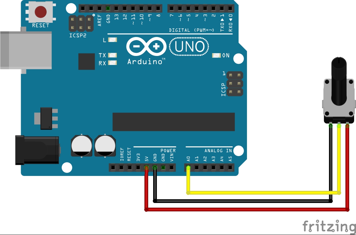 8.아두이노의 아날로그0번핀에 가변저항을 연결하고 10bit 아날로그값(0~1023)을 파이썬으로 전송해서 화면에 출력하시오!(전송간격은 100밀리초)