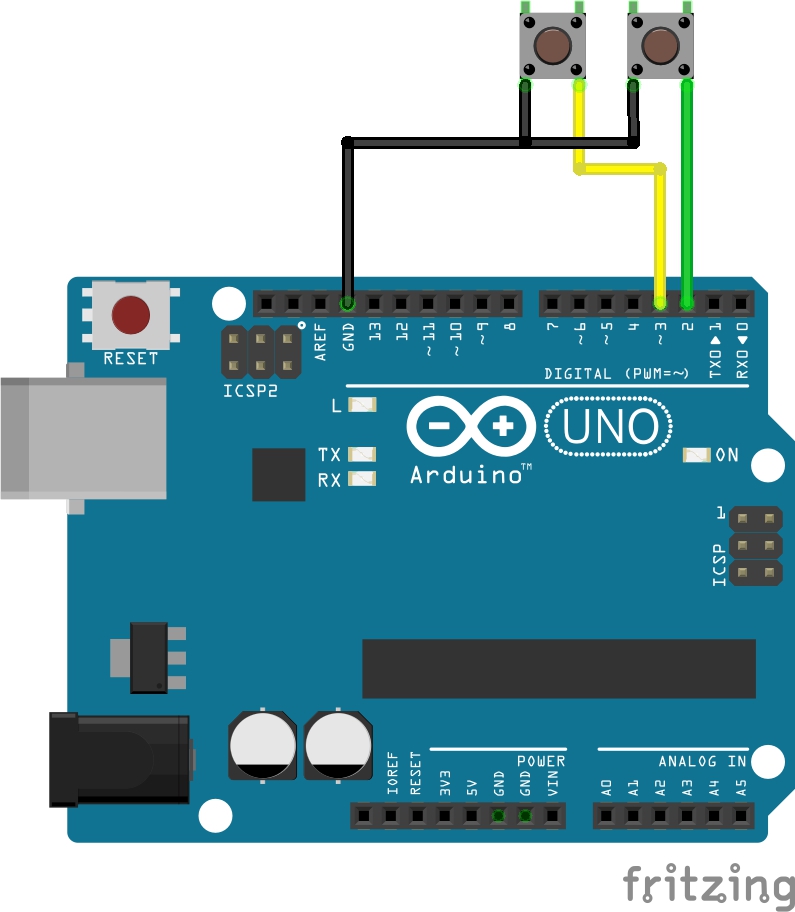 6.아두이노에 2번핀과 3번핀에 버튼(택트스위치)이 연결하고 2번핀에 연결된 버튼을 누르면 “버튼1 눌려짐!”이라고 파이썬으로 전송해서 출력하고 3번핀에 연결된 버튼을 누르면 “버튼2 눌려짐!”이라고 전송해서 출력하시오!