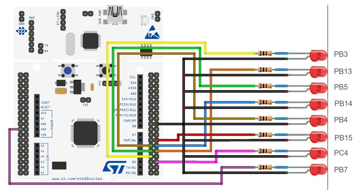 7.PB1에 연결된 버튼을 누를때마다 LED가 1번부터 8번방향으로 이동하고, PA8에 연결된 버튼을 누르면 반대방향으로 LED를 켜지도록 하시오!