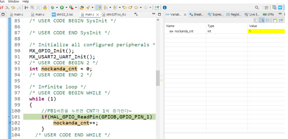 2.버튼중에 PB1번 버튼을 누르면 nockanda_cnt가 1씩 증가하는데, 녹칸다가 버튼을 누른게 STM32에서 제대로 인식이 되었는지 아닌지를 디버깅모드에서 확인해보시오!