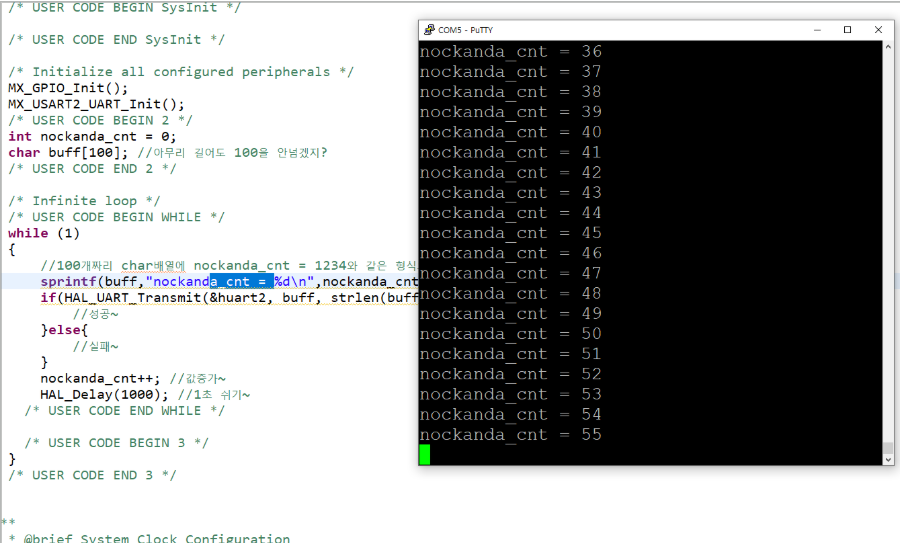 4.STM32내부에 1초간격으로 증가하는 nockanda_cnt라는 변수가 있는데, 이 변수의 현재 값을 “nockanda_cnt = 1234”와 같은 형식으로 putty로 전송해서 출력하시오!