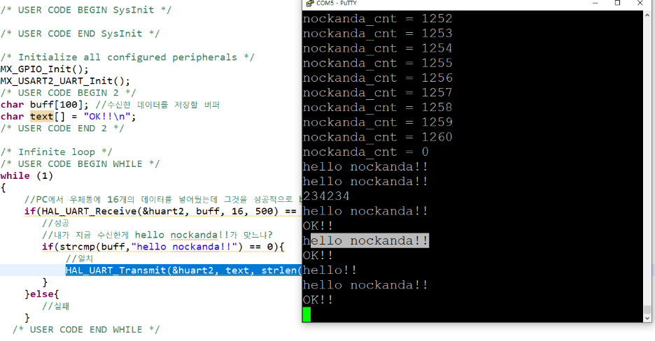 5.이번에는 putty에서 STM32쪽으로 고정되어있는 데이터를 전송할때 그 데이터를 수신해서 디버깅모드에서 확인하시오!(전송하는 데이터=hello nockanda!!) 그리고 정확히 hello nockanda!!인게 확인이 되면 OK를 응답하도록 하시오!