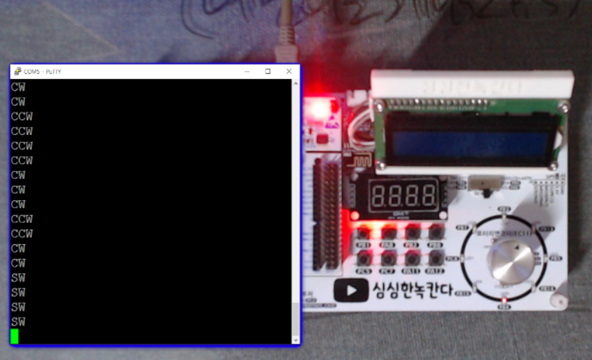 4.로터리엔코더를 폴링방식으로 처리해서 시계방향으로 회전하냐, 반시계방향으로 회전하냐, 스위치를 눌렀냐를 판별해서 시리얼출력하시오!