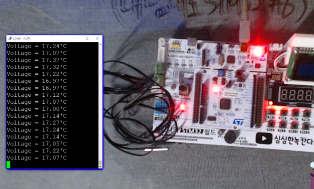 7.PA4에 연결된 NTC서미스터의 온도값을 측정해서 100밀리초간격으로 출력하시오!(온도값을 소수점이하 2자리만 살리고 ‘C단위를 붙히시오)