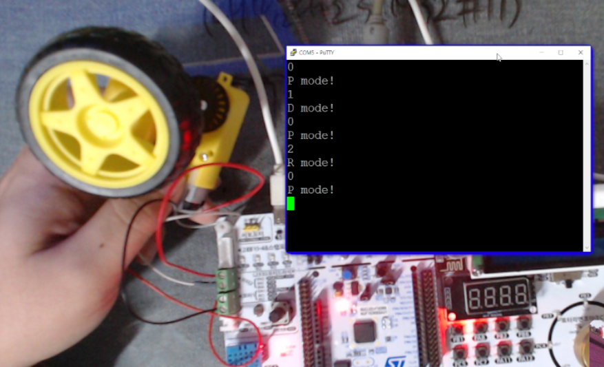 8.로터리엔코더를 시계방향으로 살짝 돌려서 팅구면 녹칸다의 자동차가 D모드가 되면서 모터1은 정회전, 모터2는 역회전하면서 전진한다, 반시계방향으로 딱 팅구면 R모드가 되면서 모터1은 역회전, 모터2는 정회전하면서 후진한다, 로터리엔코더를 누르면 P모드가 되면서 멈춘다!(녹칸다의 전기차)