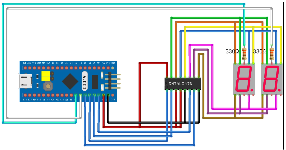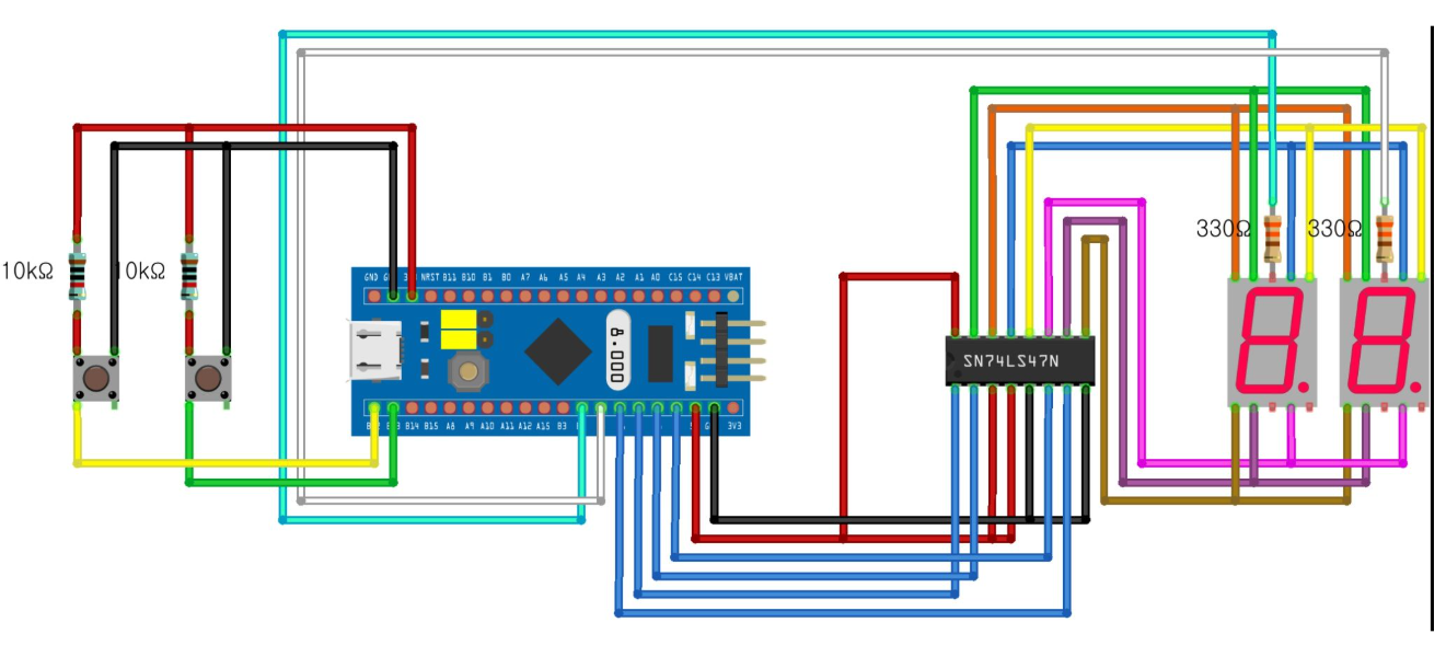 5.임베디드기능사에서 나오는 문제를 P6~P9까지를 PB6~PB9까지 연결 P10을 PB4, P11을 PB5에 연결해서 FND에 숫자 두자리(15)를 출력하시오!