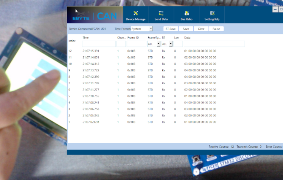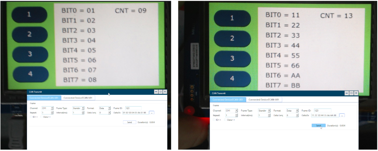 2.(예제1과 동시에 동작함)PC쪽 캔통신 프로그램에서 캔메시지를 전송하면 전송된 캔메시지를 touchgfx로 만든 UI에 출력되도록 하시오! 캔메시지는 8개의 byte로 구성되도록하고 8개의 byte값을 8개의 textarea를 이용해서 출력하시오!(PC에서 STM32쪽으로 전송)